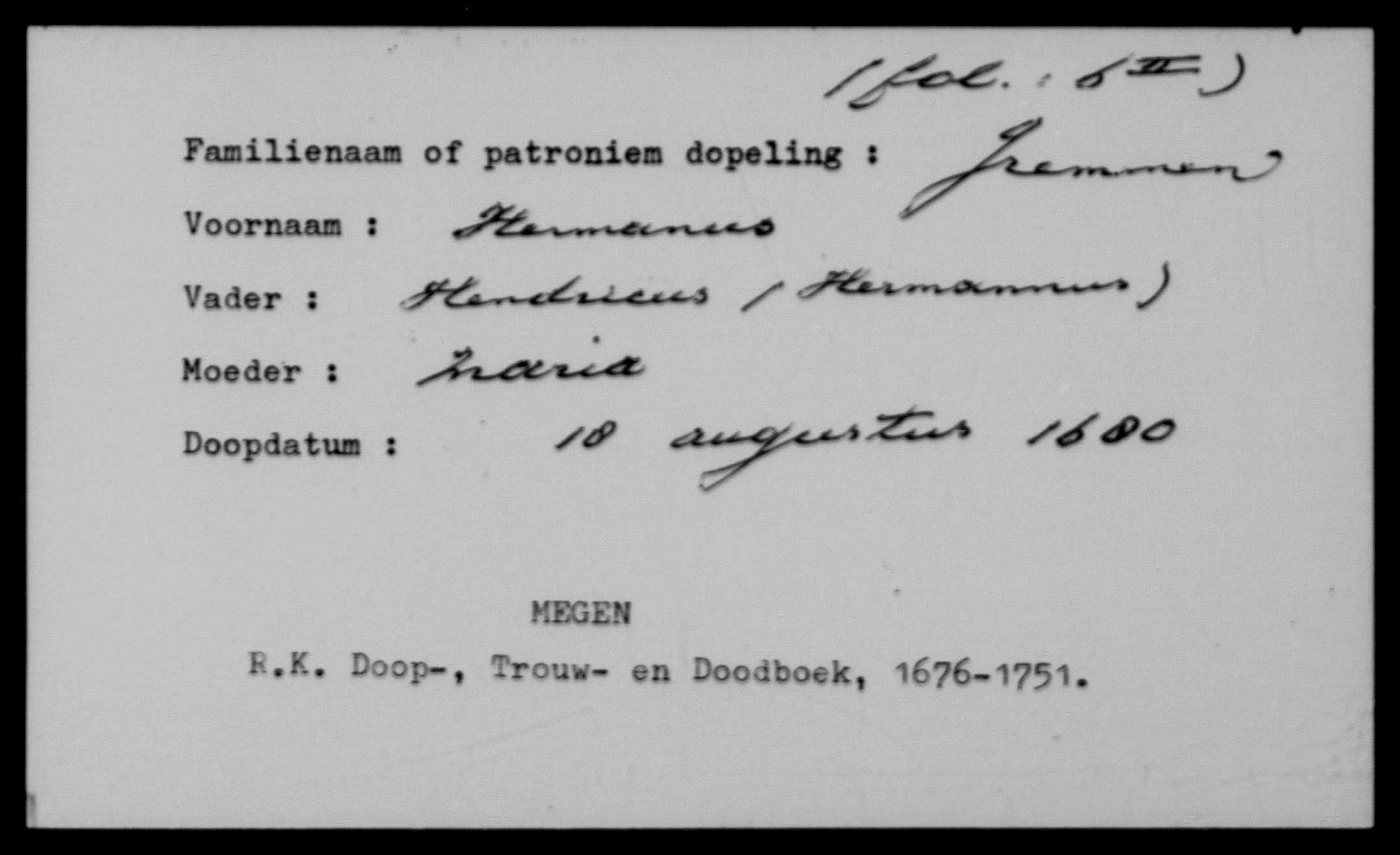 | zoon van Hendricus Hermanii Gremmen (1646-1696) en Maria van Oss (?-?) | ||