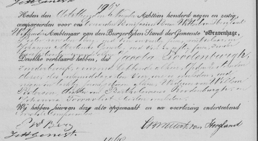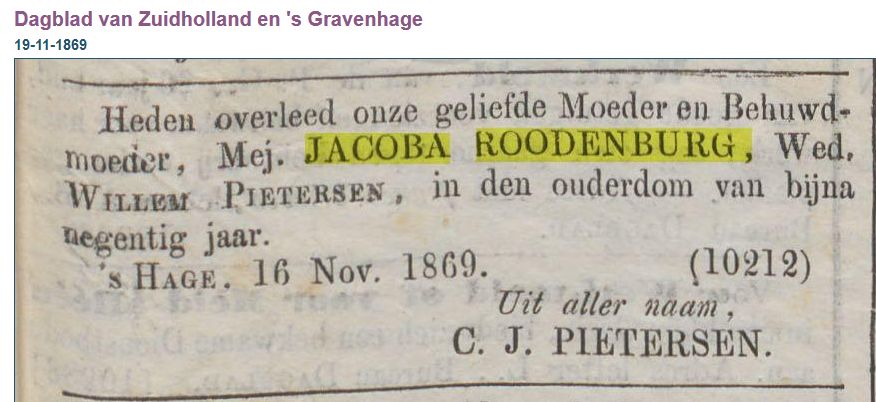 Overlijdensadvertentie. 16 november 1869. Den Haag.