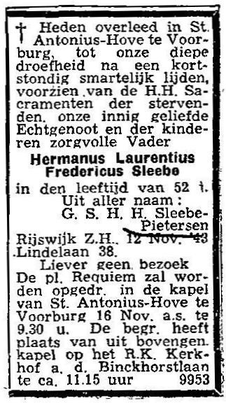 Overlijdensadvertentie. 12 november 1943 Leidschendam.