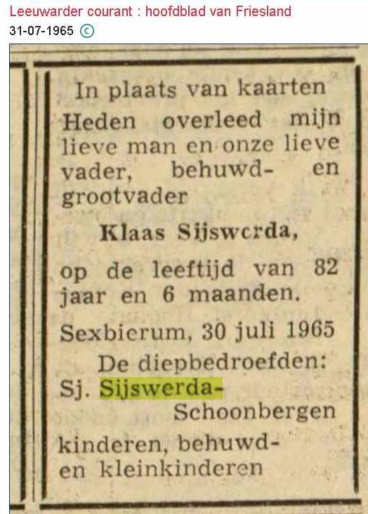 | home stamboom Sieswerda, Sijswerda, Syswerda | Klaas Sijswerda (1883-1965) | Sieswerda, Sijswerda, Syswerda stamboom home |
