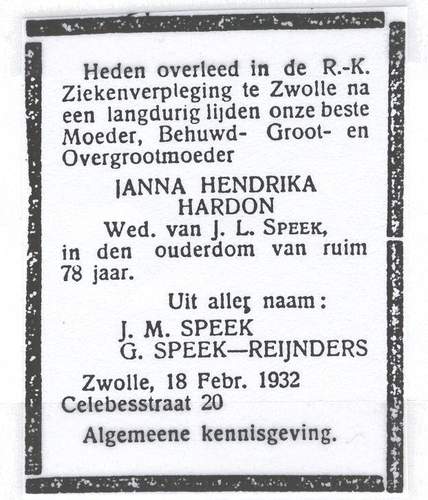 | home | Janna Hendrika Hardon (1853-1932) gehuwd met Johan Lourens Speek (1850-1918) |