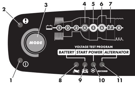 - druk op de mode-knop (3) om over te schakelen tussen de testprogramma's: BATTERY (9), START POWER (10) en ALTERNATOR (11)