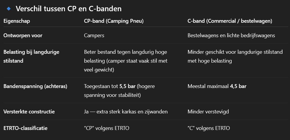 - Camping. Voor (zware) campers moet je een band hebben waar de aanduiding 'camping' of 'camper' op staat.
