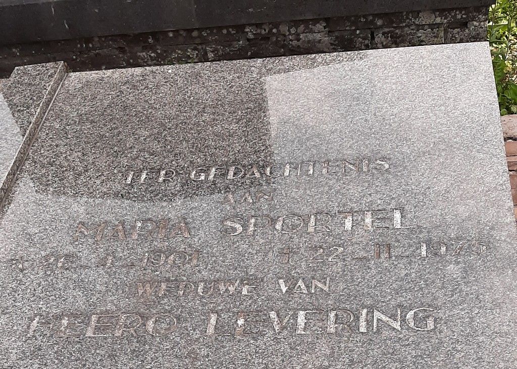 | 2. | m | Geert Koert (Geert) SPORTEL [20181], machine bankwerker, grafsteen. .(Check de Oorlogsgravenstichting). Geboren op 23-07-1916 te Midwolda.Overleden op 24-06-1943 te Vlissingen op 26-jarige leeftijd. Begraven op 29-06-1943 te Groningen, Noorderbegraafplaats. (In de persoonskaart van Geert Koert staan geen kinderen vermeld). Ondertrouwd 00-04-1941 te Groningen.Gehuwd op 24-jarige leeftijd op 19-05-1941 te Groningen. Echtgenote is Wilhelmina BROEKEMA [21882], 23 jaar oud. Geboren op 29-05-1917 te Groningen. Overleden op 07-05-1994 te Groningen op 76-jarige leeftijd. Begraven te Groningen, Noorderbegraafplaats. |