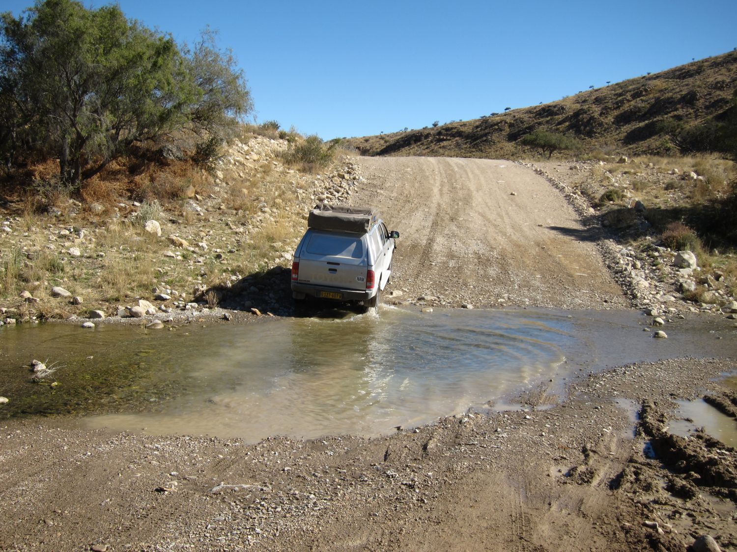 Dag 2: ochtend pickup auto bij Asco Car Hire; inkopen gedaan; middag: 100 kilometer binnendoor naar Rehoboth Oanob Dam camping (S23.32213 E17.01628); |