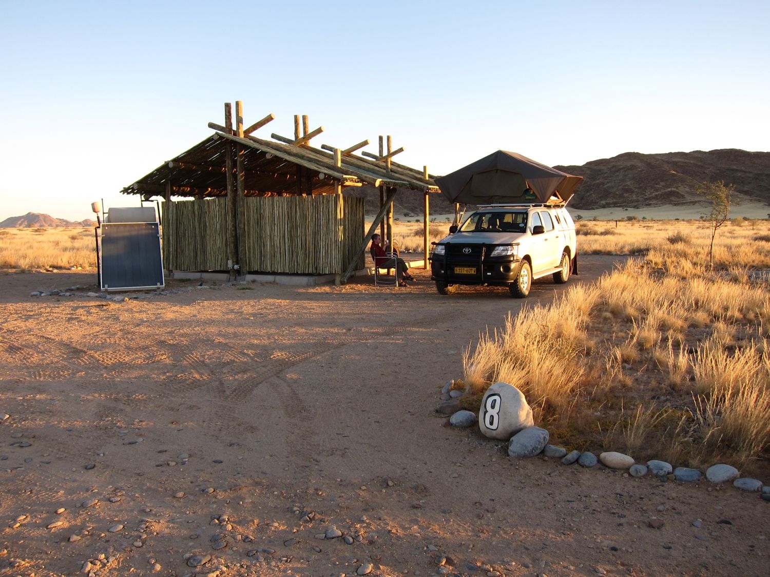 Dag 3: ochtend vertrek uit Rehoboth, ca. 250 kilometer rijden naar Sesriem, Sossus Oasis Campsite (100 meter van de Sossusvlei toegangspoort, (S24.49003 E15.80450), 200 NAD pp per nacht, hele ruime camping, elke plek heeft eigen wc/douche, 220V, veel schaduw); leuke kampeerplek, avond en nacht koud (10 graden). |