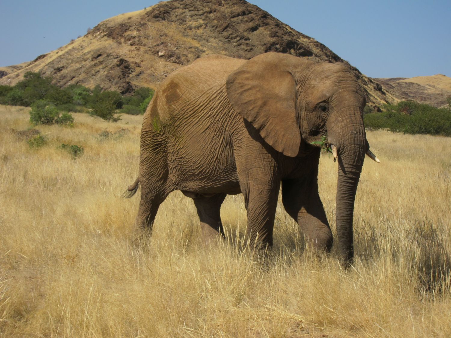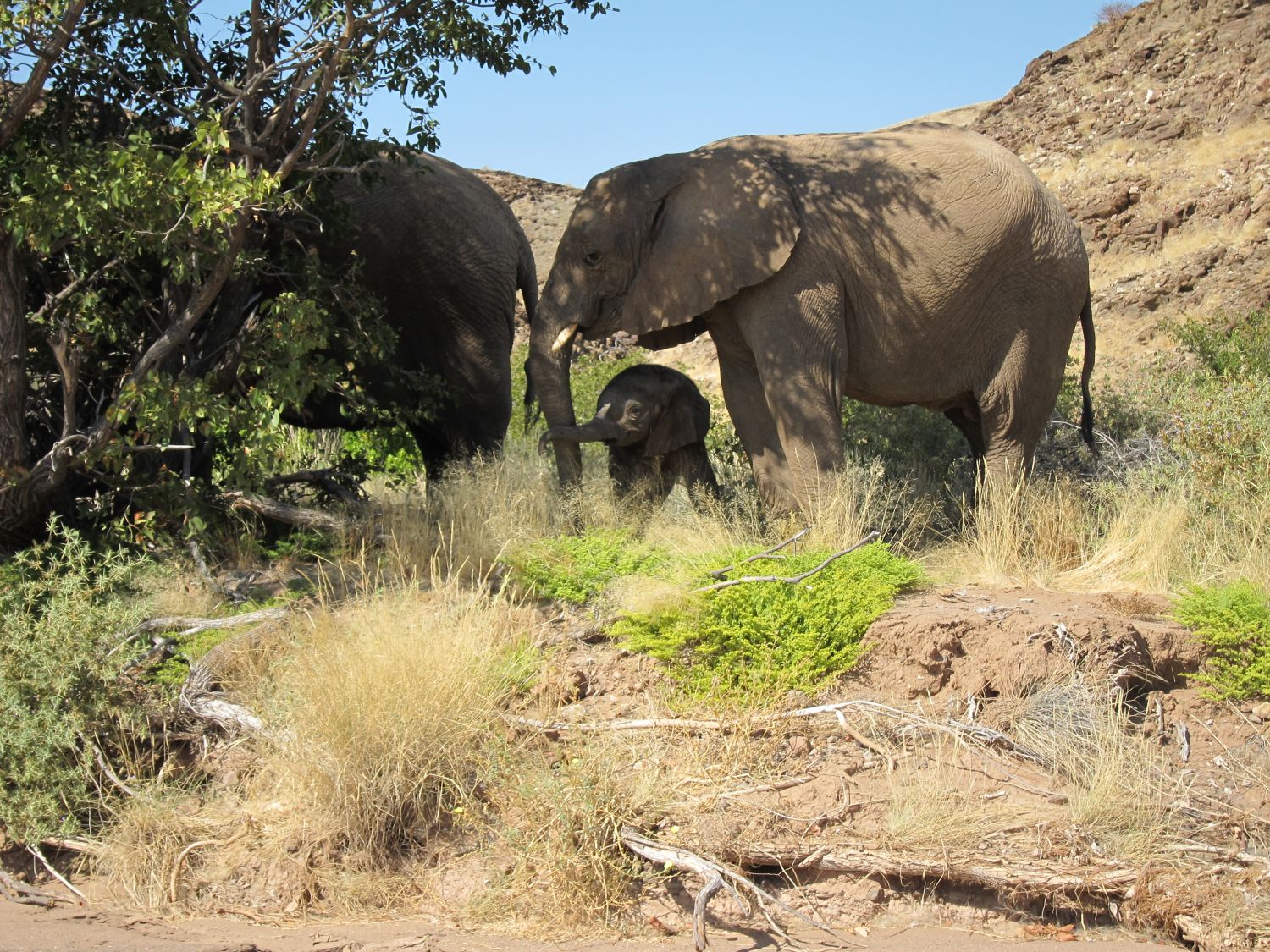 Dag 13: ochtend gamedrive (450 NAD pp) vanuit Xaragu op zoek naar woestijnolifanten, prachtig, really off-road, de woestijnolifanten drinken altijd bij de bron van een bepaalde boerderij en zwerven dan dagenlang door het landschap; middag vertrek naar Outjo, Bushveld Park Lodge (S20.09466 E16.12717), 80 NAD pp per nacht, 220V, niks bijzonders, maar prima doorreis-plek). |