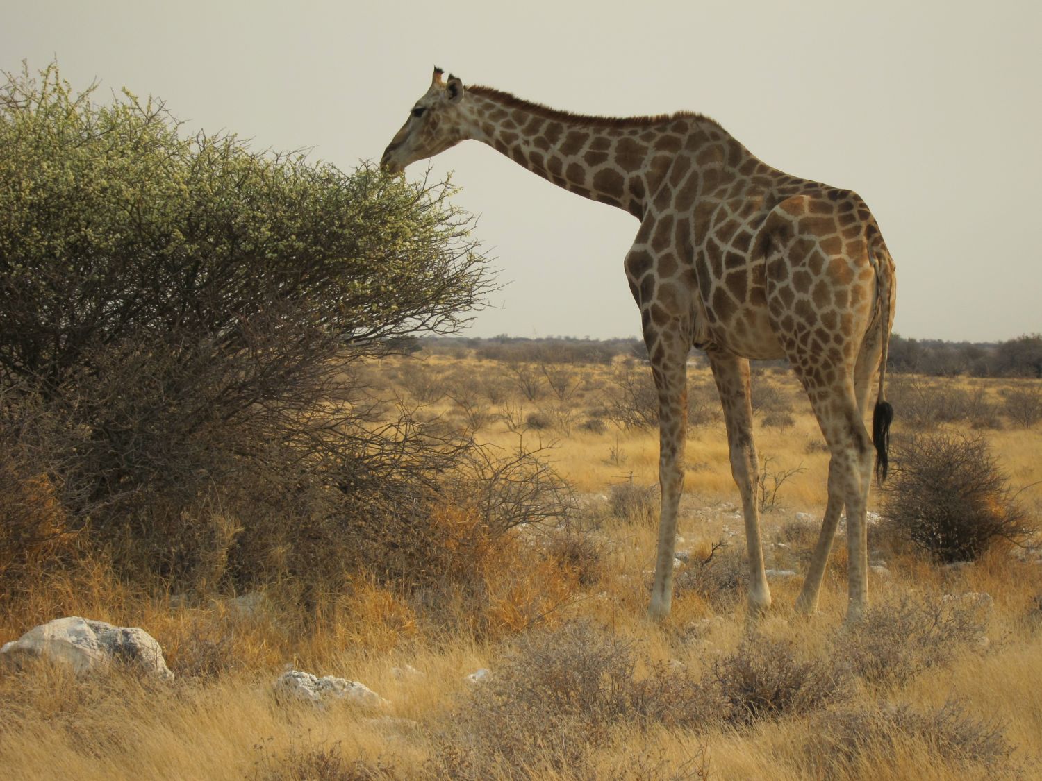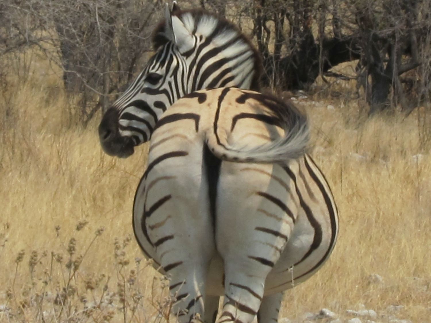 Dag 15: vertrek uit Mondjila, ca. 100 rijden, aankomst in Etosha Halali Camp (S19.03503 E 16.47112, 200 NAD pp per nacht, 220V, stoffig, weinig schaduw, grote camping, kleine plekken). Veel typische vogels (secretarisvogel), hordes springbokken, hartebeesten, kudus, wildebeesten, zebra, giraffe; 's avonds bij de waterhole van Halali (hyena en twee witte neushoorns). |