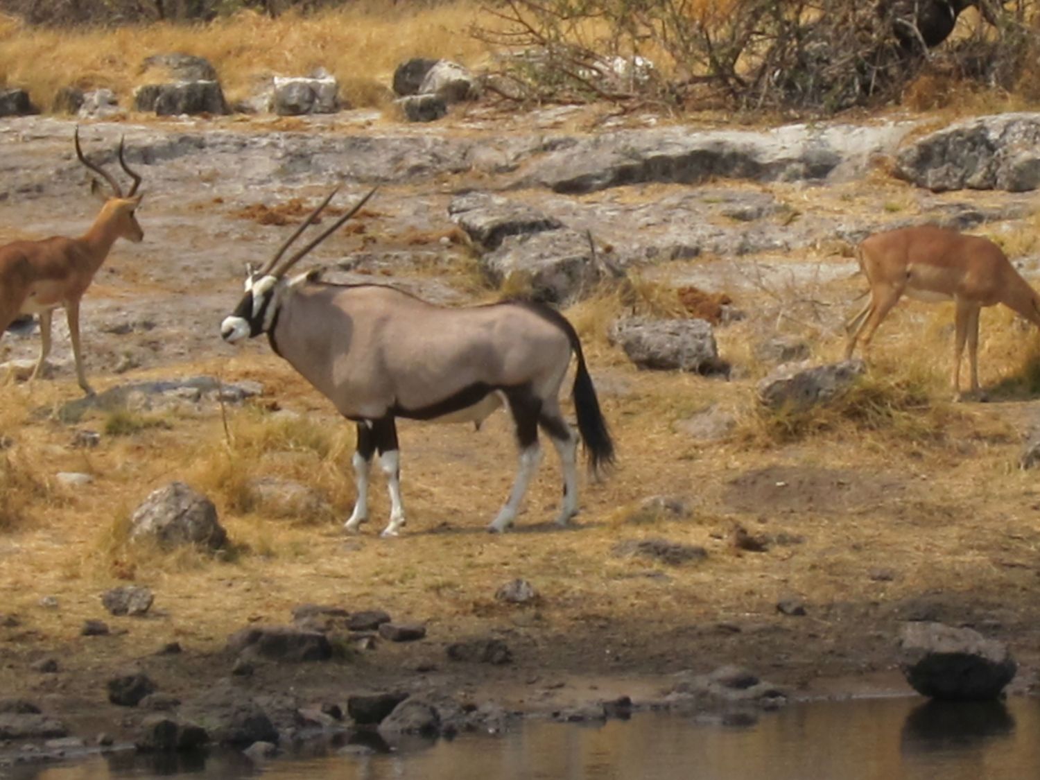 Dag 17: ochtend weer naar Goas waterhole (jachtluipaard, gier, gewonde impala), een andere waterhole met drie olifanten op 30 meter afstand en een mooie gemsbok; 's avonds een gamedrive (550 NAD pp...): leeuw; neushoorns (wit en zwart), olifanten op vijf meter voor de auto. Een door Halali georganiseerde gamedrive overdag (450 NAD pp) is prima (beter) zelf te doen en de gamedrive 's nachts vinden wij de 550 NAD pp eigenlijk niet waard, je rijdt dezelfde wegen en bezoekt dezelfde waterholes als overdag en de gids vertelt je wat je ziet, big deal; helaas heb je zelf niet de mogelijkheid en toestemming om 's nachts in het park te rijden want de poort van het kamp is gesloten van zonsondergang t/m zonsopgang. Onze mening over Etosha (voor wat het je waard is): het is een grote (250x100km) dierentuin met een hek er omheen (waarvan de oostelijke helft alleen toegankelijk is voor een paar reisorganisaties); dankt zijn 'naam en faam' aan het vele (!) wild wat braaf komt drinken bij kunstmatig gevulde waterholes (waar elders kun je binnen een paar dagen leeuw, hyena, jachtluipaard, zwarte en witte neushoorn 'afstrepen', eldorado voor fotografen); eentonig-uniform landschap; druk, bij elke waterhole sta je met een aantal auto's; qua landschap is Okavango (Moremi) en South Luangwa mooier / gevarieerder; Etosha was een mooie ervaring, maar we gaan liever ergens anders naar toe. |