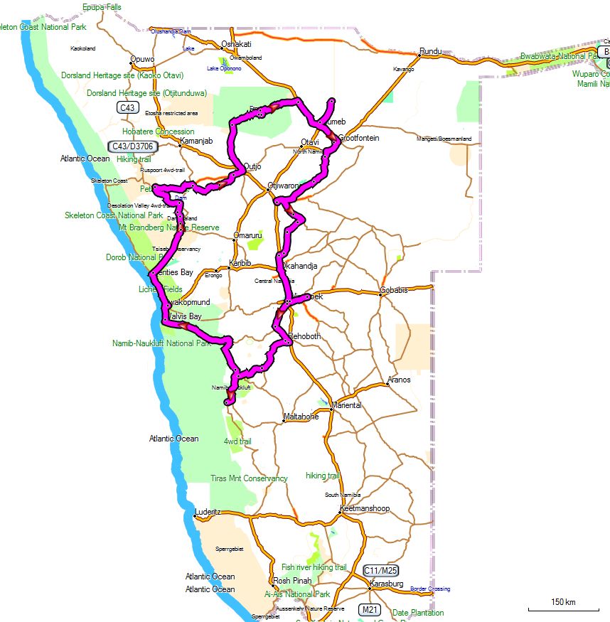 Een paar kant-en-klare routes van Explore Namibia dienden voor ons als uitgangspunt - eerste idee - oriëntatie voor onze rondreis. Wij houden er niet van om elke dag naar een volgende overnachtingsplek te vertrekken, dus ik heb een 22 daagse route gemaakt met vijf punten waar we meerdere nachten op dezelfde plaats staan. Degene die 'thuis' is in Garmin spullen ziet dat de route die hiernaast is weergegeven gemaakt is met MapSource en de kaart van Namibië van T4A. Stuur me een e-mail als je geïnteresseerd bent in de waypoints die ik deze reis gebruikt hebt op mijn navi. |